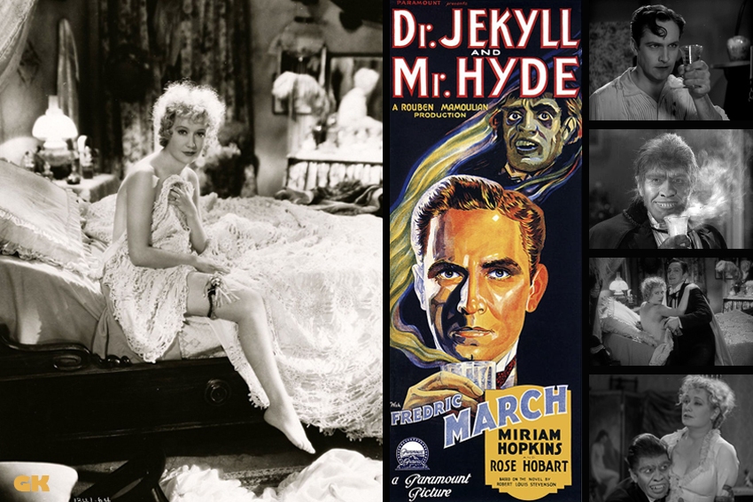 Le film de Mamoulian commence par la Toccata de Bach, belle entrée en matière pour mettre dans l’ambiance, puis s’en suivent de nombreuses trouvailles techniques, je me suis souvent demandé au cours du visionnage si je voyais là les premières de ces inventions, j’ai donc cherché un peu. La première scène commence donc par une vue subjective à la première personne, oui comme dans un FPS sur PS5, c’est une sacrée idée pour 1931 et c’est bien la première fois que c’est utilisé. Mamoulian en fera usage plusieurs fois dans le film, mais son utilisation n’est pas toujours déterminante, à part pour les transformations. Il y a aussi des écrans joliment splittés d’une manière progressive, des fondus enchaînés qui s’attardent, des rémanences de scènes précédentes qui perdurent un moment dans la scène suivante comme celle du personnage féminin Ivy, joué par Miriam Hopkins, qui assise nue sur le bord de son lit, balance langoureusement sa jambe droite comme le balancier d’une horloge, image obsédante de sensualité qui absorbe l’esprit de Jekyll et donc du spectateur. Il y a aussi les transformations en Hyde qui bénéficient d’une jolie technique pour l’époque. Les premières secondes de la première transformation sont saisissantes, Mamoulian a réussi un beau coup technique en n’utilisant visiblement qu’un jeu de lumière pour modifier les traits de Jekyll et c’est vraiment bien fait. La seconde transformation est aussi très réussie, cette fois il ajoute des coupures avec des plans alternativement sur le visage, puis sur les mains de Jekyll qui se change enfin en Hyde. Le montage est presque parfait et la transformation est donc très réussie. Techniquement, c’est donc très bien pour l’époque. Si je voulais chercher la petite bête, je dirais tout de même que je trouve, hélas, que ces techniques intéressantes ne sont pas vraiment utilisées pour enrichir le récit. Les écrans splittés par exemple, s’ils sont réussis, mais ils n’apportent rien de particulier au récit et c’est bien dommage, j’aurais aimé voir des évènements importants se dérouler dans le même temps. Quelques gros plans me semblent nativement flous, peut-être quelques problèmes de mise au point durant le tournage.