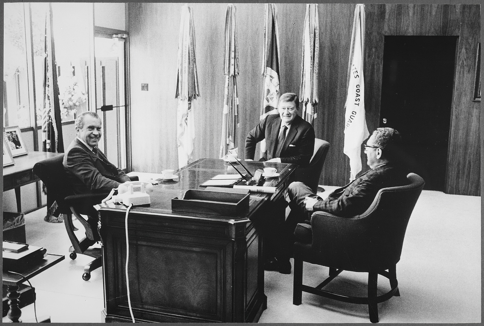 De gauche à droite. Le président Nixon, John Wayne et Henry Kissinger - 1972.