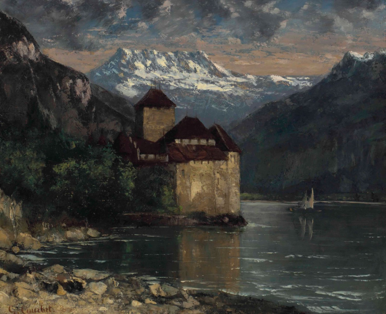 Ainsi la Suisse sera son dernier domicile et même si son état de santé déclinera, il continuera à y peindre et à laisser quelques magnifiques toiles. Il est pourtant fatigué, depuis la quarantaine il a considérablement forci et c’est une silhouette empâtée qui se promènera autour du lac Léman pour prendre comme sujet d’étude une forteresse médiévale. J’ai toujours admiré ses représentations du château de Chillon, il s’en dégage un sentiment particulier qui mêle la nature, à la puissance de la construction médiévale. Ces œuvres figurent parmi les dernières de Courbet qui mourra le 31 décembre 1877 à l’âge de 57 ans seulement. Son œuvre est trop imposante pour en brosser le portrait en quelques lignes, il faut se plonger dans les livres et aller voir ses tableaux dans les musées pour saisir la puissance qui s’en dégage. Nous avons de la chance, la France possède une belle collection de l’artiste, à Ornans dans le Doubs, à Lille, à Montpellier, à Besançon et le plus gros de son oeuvre à Paris au Musée d’Orsay où vos pas pourront vous mener par exemple vers un tableau de 1869 s’intitulant La falaise d’Etretat après l’orage et annonçant déjà un autre mouvement qui allait suivre, celui de l’impressionnisme.