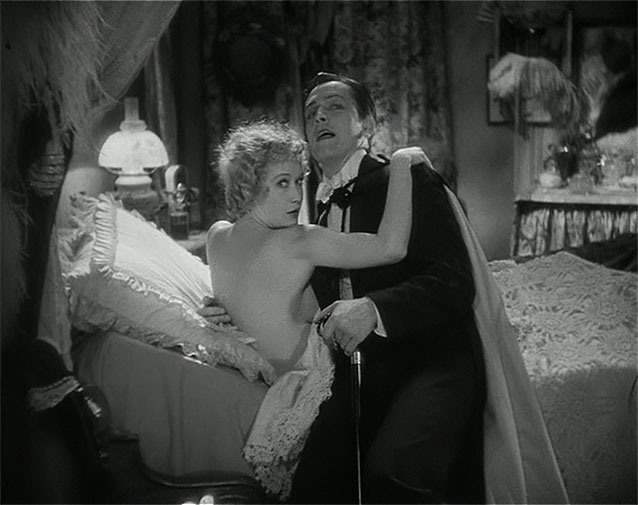 Artistiquement, Mamoulian a décidé de faire de Hyde une sorte d’homme préhistorique, il en a le physique et la pilosité. C’est assez éloigné du roman où Hyde est très petit, sans doute un peu contrefait et bien plus jeune que le docteur (la potion est aussi une sorte de fontaine de jouvence, Jekyll nous le dit dans le livre)), il n’est pas si repoussant, il est qualifié de dérangeant par ceux qui le croisent, mais pas de monstrueux. Seules ses mains sont visiblement poilues, Jekyll le dit clairement dans le roman : « Main revêtue d’une épaisse pilosité, c’était la main de Hyde. » C’est plutôt son attitude qui dérange le plus, car elle sort totalement des conventions de la bienséance, elle est sans limite, habitée par la pure brutalité et l’égoïsme poussé à son paroxysme pour satisfaire ses pulsions. C’est aussi le cas ici, Hyde est odieux, brutal, un malappris vicieux, pervers, sadique qui laissent s’exprimer ses pulsions primitives sans retenue, et bien sûr ses pulsions sexuelles puisque dans le film comme je le disais plus haut, le docteur est frustré par l’attente (et donc la consommation) de son mariage. Il est en revanche totalement émoustillé par Ivy Pearson la jolie fille de petite vertu ouvertement libérée et assumant sa beauté et sa sexualité sur laquelle il fait une fixation. C’est bien sûr très intéressant pour l’époque, on est encore dans un film d’avant le code Hays, cependant d’après Mamoulian, certaines scènes trop osées ont tout de même été coupées au montage, notamment un striptease sous les draps qui a été raccourci. Mais pour 1931, c’est déjà assez explicite je trouve. Ivy qui entraîne le docteur Jekyll dans son lit pour essayer de l’embrasser alors qu’elle est visiblement toute nue sous ses draps, c’est plus que le code Hays ne pourra supporter quelques années plus tard…