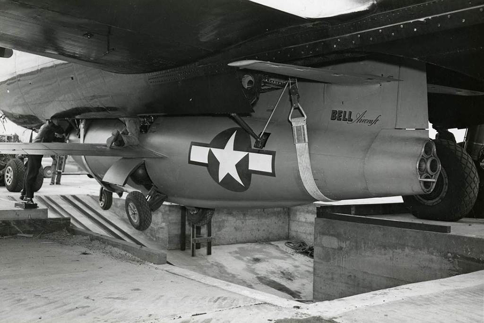 Le Bell X-1 sous la carlingue du B29 avant la tentative de passage du mur du son