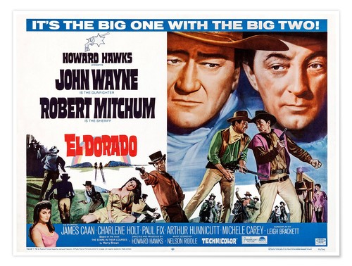 El Dorado, c’est la résistance du western hollywoodien classique qui doit faire face à la même époque à la magnifique offensive de Sergio Leone, une montée en puissance d’un cinéma aux codes différents que rien n’arrêtera pendant la décennie. 1966, souvenons-nous que c’est aussi l’année de Le Bon, la Brute et le Truand... deux mondes artistiques, le même thème, deux grands films, deux magnifiques westerns, deux chefs-d’œuvre bien différents. Pour finir avec El Dorado, le thème musical qui illustre le générique du début est très réussi, entêtant, il nous plonge dans une vision sublimée du Far West accompagnant parfaitement les superbes tableaux d'Olaf Wieghorst choisis pour le générique. Bien sûr, ce n'est pas la musique de Morricone, mais là, on touche au génie musical. El Dorado, un chef d'œuvre, sans doute l'un des derniers grands westerns classiques que l’on puisse voir et qui cloture magnifiquement l'âge d'or hollywoodien, profitant encore de l'aura des ses grands acteurs. Je ne me lasserai sans doute jamais de le regarder, me laissant emporter par le charisme de Wayne et les légendes de l’Ouest qu'il traîne avec lui. Wayne fut le cowboy d'Hollywood, le "Duke" comme on l'appelait, Clint Eastwood en fut un autre, mais cela, c'est une autre projection, pardon, une autre histoire...